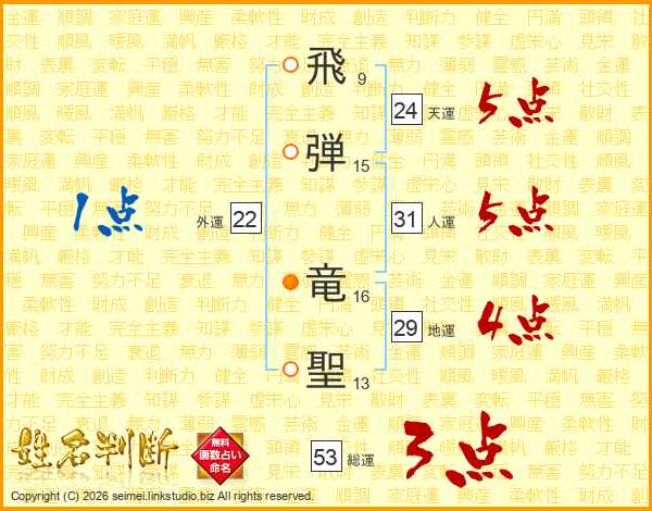 飛弾竜聖さんの総運は53画の3点!