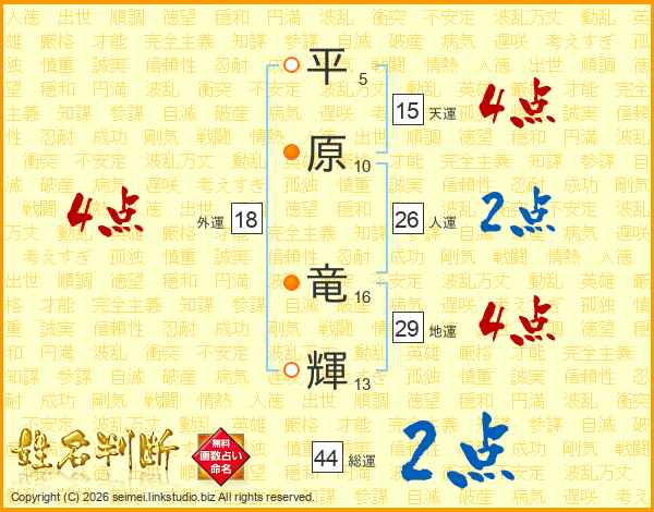 あなたの人生を表す1番重要な運勢です。生涯を通じて影響する総合運となり、主に50歳以降の晩年期に影響を及ぼします。苗字と名前の合計画数。