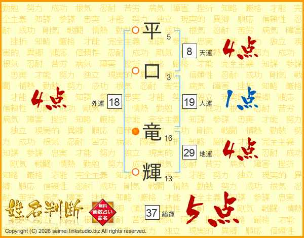 家系が持つ宿命的な運勢を表します。祖先から受け継いだ苗字ですので自分の力が及びません。家柄を象徴します。苗字の合計画数。