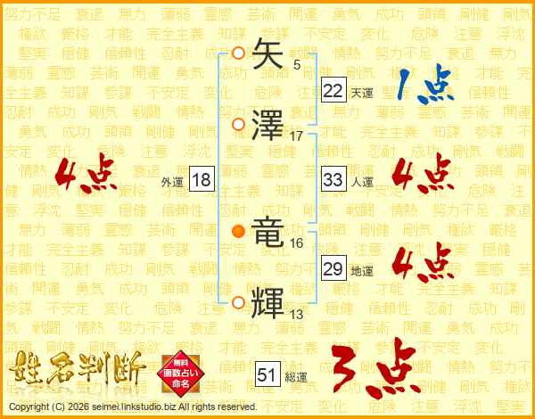 矢澤竜輝さんの人運は33画の4点!