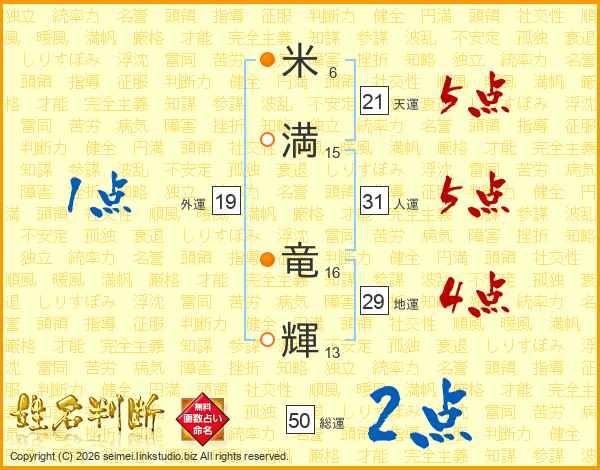 米(6画)満(15画) 竜(16画)輝(13画)