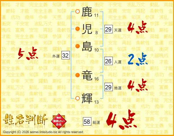 鹿児島竜輝さんの総運は58画の4点!