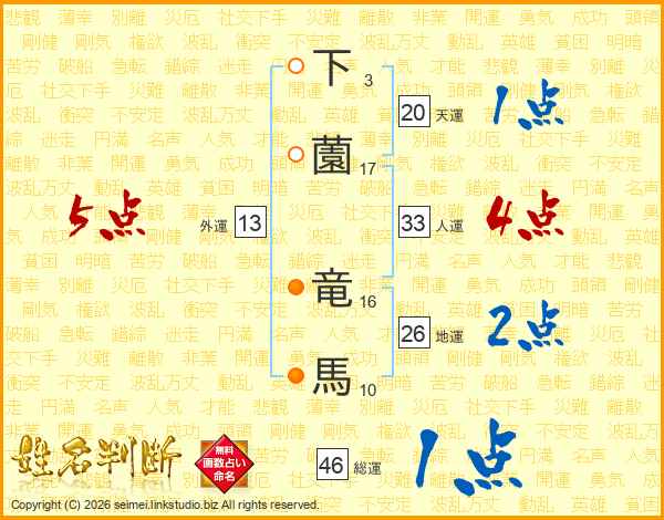 下(3画)薗(17画) 竜(16画)馬(10画)