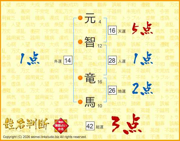 元(4画)智(12画) 竜(16画)馬(10画)