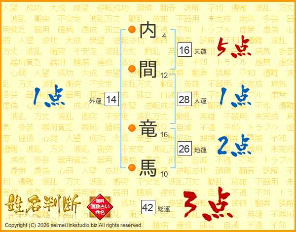 内(4画)間(12画) 竜(16画)馬(10画)