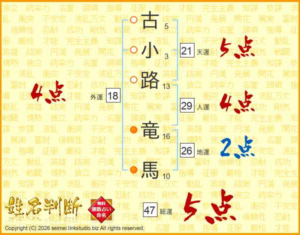 古(5画)小(3画)路(13画) 竜(16画)馬(10画)