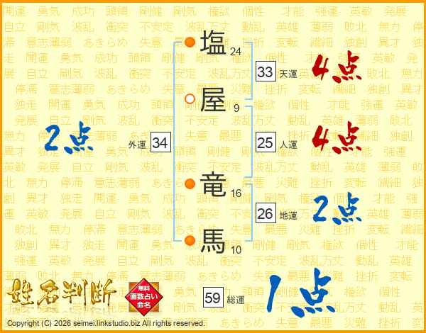 塩(24画)屋(9画) 竜(16画)馬(10画)
