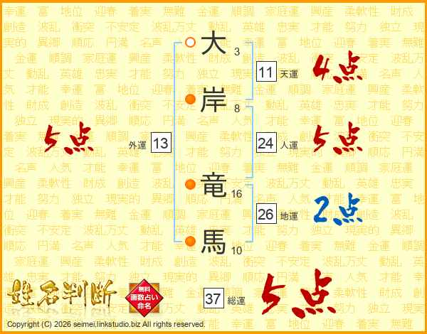 大岸竜馬さんの総運は37画の5点!