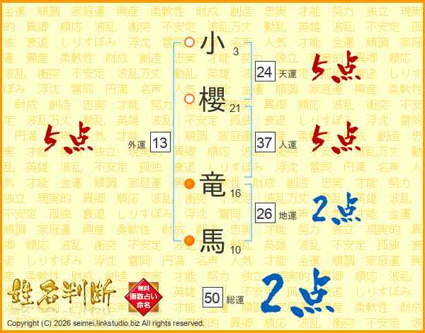 小(3画)櫻(21画) 竜(16画)馬(10画)