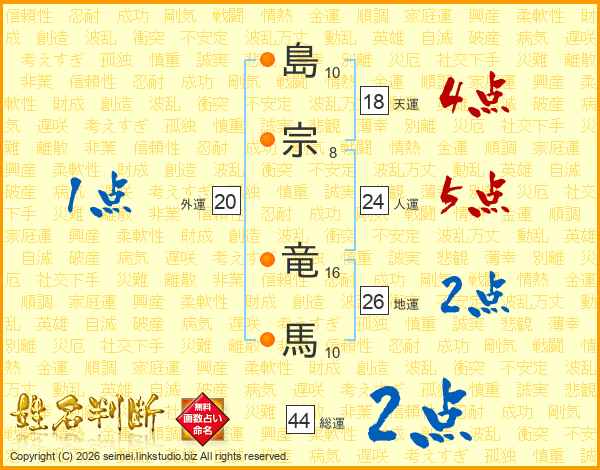 島(10画)宗(8画) 竜(16画)馬(10画)