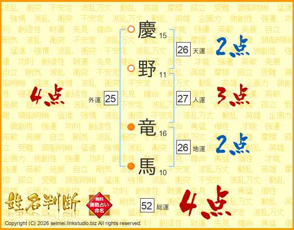 慶野竜馬さんの総運は52画の4点!