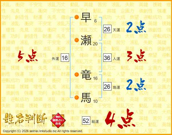 早瀬竜馬さんの総運は52画の4点!