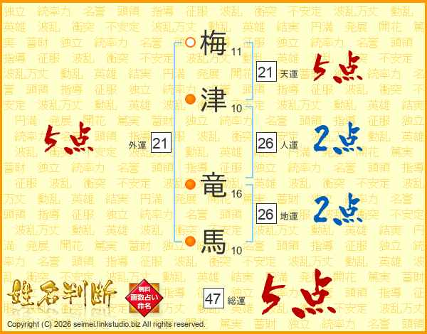 梅(11画)津(10画) 竜(16画)馬(10画)