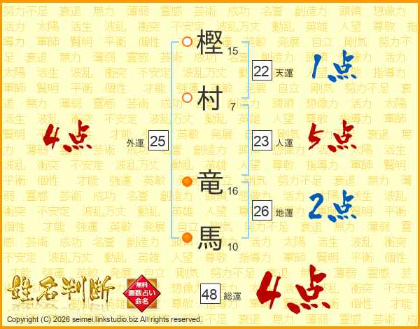 樫(15画)村(7画) 竜(16画)馬(10画)