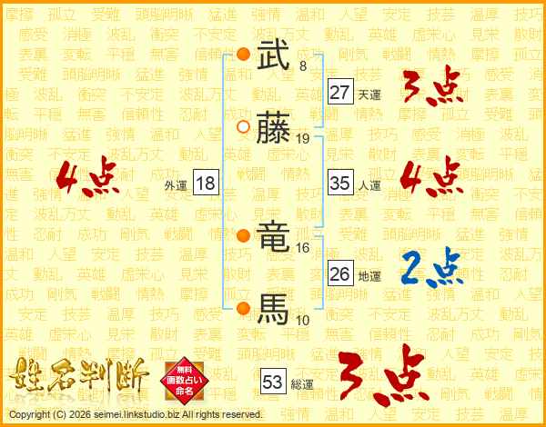 武(8画)藤(19画) 竜(16画)馬(10画)