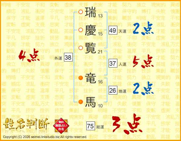 瑞慶覧竜馬さんの総運は75画の3点!