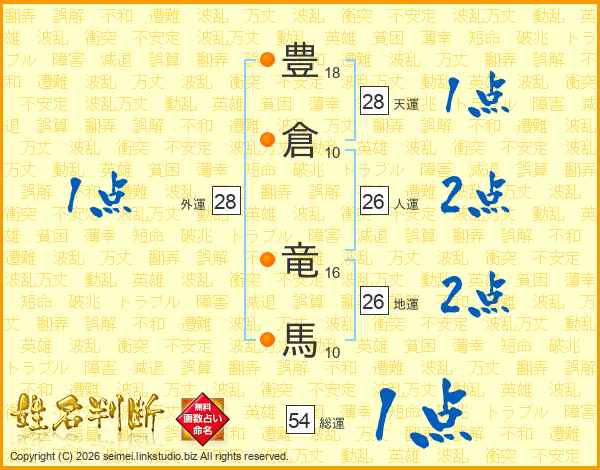 豊(18画)倉(10画) 竜(16画)馬(10画)