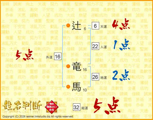 家系が持つ宿命的な運勢を表します。祖先から受け継いだ苗字ですので自分の力が及びません。家柄を象徴します。苗字の合計画数。