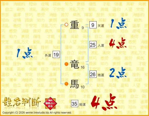 家系が持つ宿命的な運勢を表します。祖先から受け継いだ苗字ですので自分の力が及びません。家柄を象徴します。苗字の合計画数。