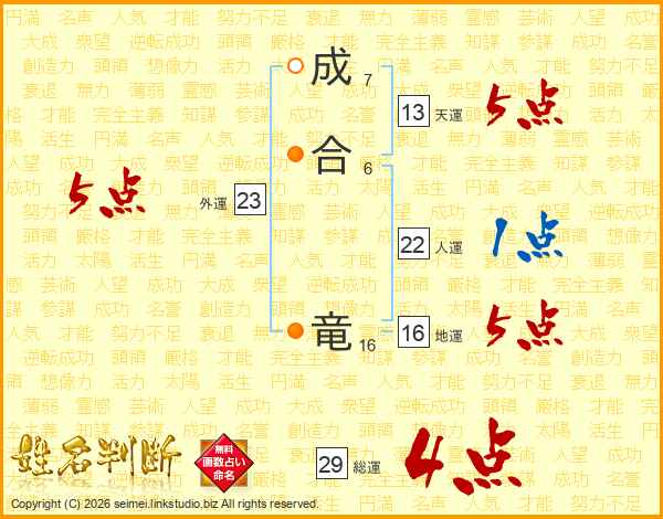 あなたの人生を表す1番重要な運勢です。生涯を通じて影響する総合運となり、主に50歳以降の晩年期に影響を及ぼします。苗字と名前の合計画数。