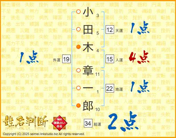小(3画)田(5画)木(4画) 章(11画)一(1画)郎(10画)