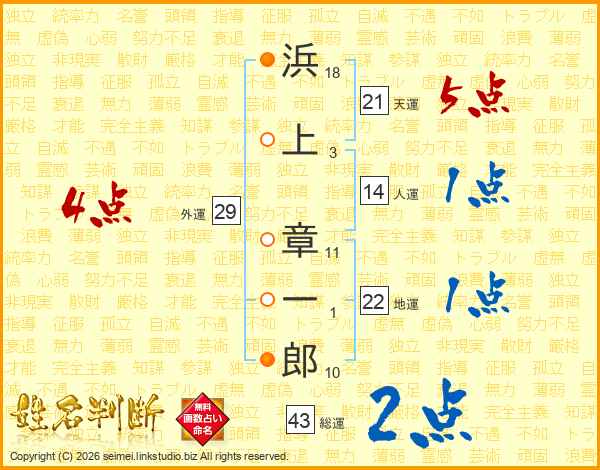 浜(18画)上(3画) 章(11画)一(1画)郎(10画)