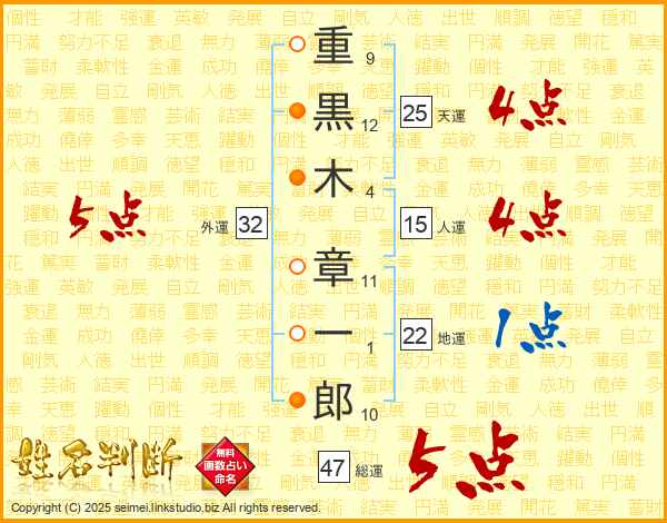 重(9画)黒(12画)木(4画) 章(11画)一(1画)郎(10画)