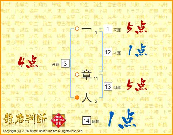あなたの人生を表す1番重要な運勢です。生涯を通じて影響する総合運となり、主に50歳以降の晩年期に影響を及ぼします。苗字と名前の合計画数。