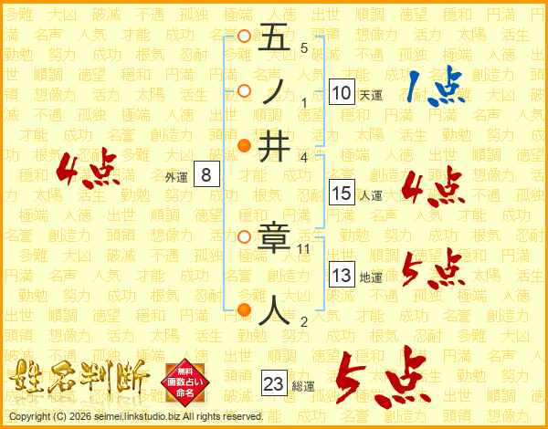 五ノ井章人さんの総運は23画の5点!