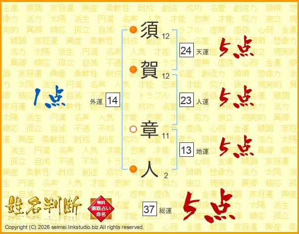 あなたの人生を表す1番重要な運勢です。生涯を通じて影響する総合運となり、主に50歳以降の晩年期に影響を及ぼします。苗字と名前の合計画数。