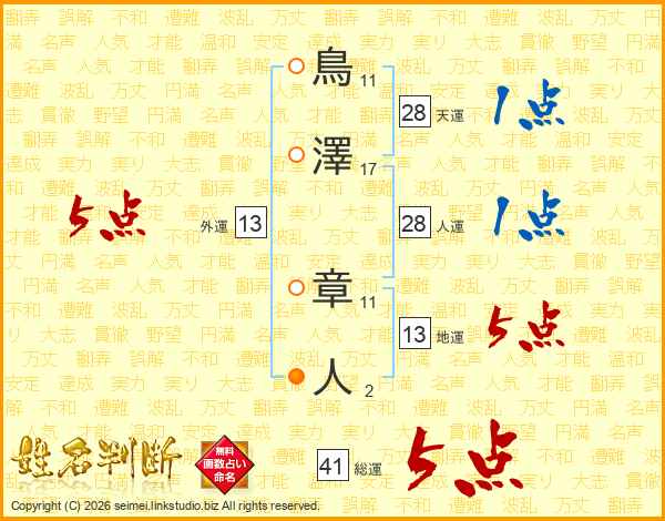 鳥澤章人さんの総運は41画の5点!