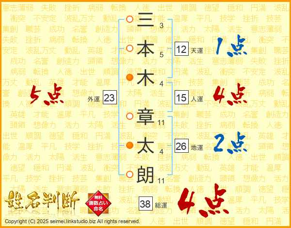 三(3画)本(5画)木(4画) 章(11画)太(4画)朗(11画)