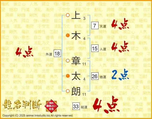 上(3画)木(4画) 章(11画)太(4画)朗(11画)