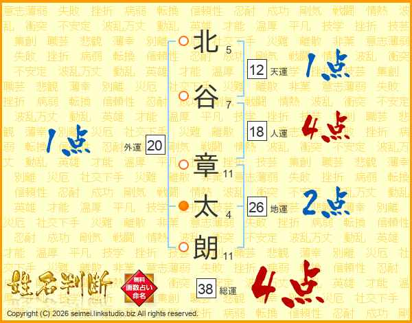 北(5画)谷(7画) 章(11画)太(4画)朗(11画)