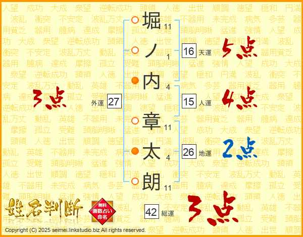 堀(11画)ノ(1画)内(4画) 章(11画)太(4画)朗(11画)