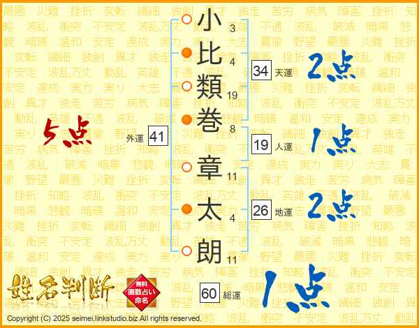 小(3画)比(4画)類(19画)巻(8画) 章(11画)太(4画)朗(11画)