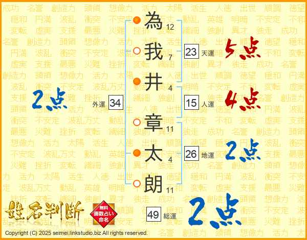 為(12画)我(7画)井(4画) 章(11画)太(4画)朗(11画)