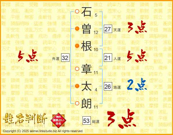 石(5画)曽(12画)根(10画) 章(11画)太(4画)朗(11画)