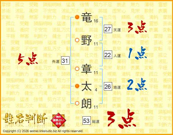 竜(16画)野(11画) 章(11画)太(4画)朗(11画)