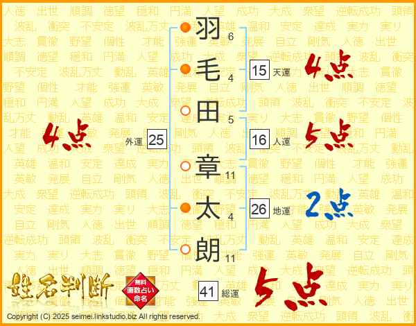 羽(6画)毛(4画)田(5画) 章(11画)太(4画)朗(11画)