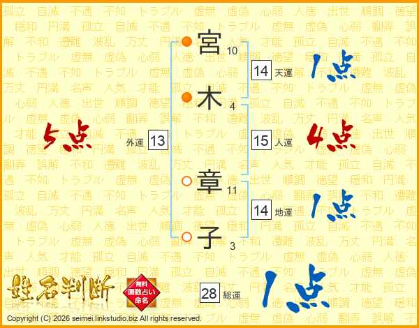 宮(10画)木(4画) 章(11画)子(3画)