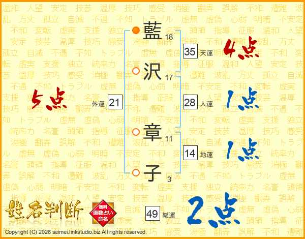 生活面を象徴する運勢です。外部から受ける影響力を表し、結婚運、家庭運や職場、環境への順応性を表します。総運から人運を引いた画数。姓や名が1文字の場合を除く。