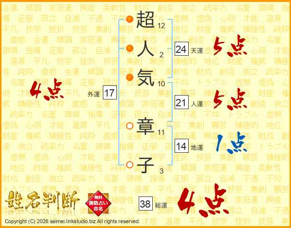 超人気章子さんの総運は38画の4点!