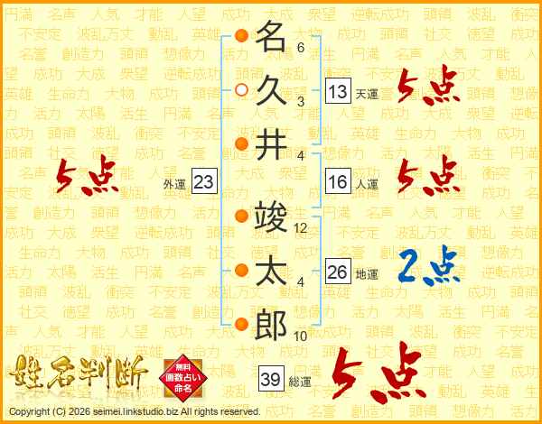 名(6画)久(3画)井(4画) 竣(12画)太(4画)郎(10画)
