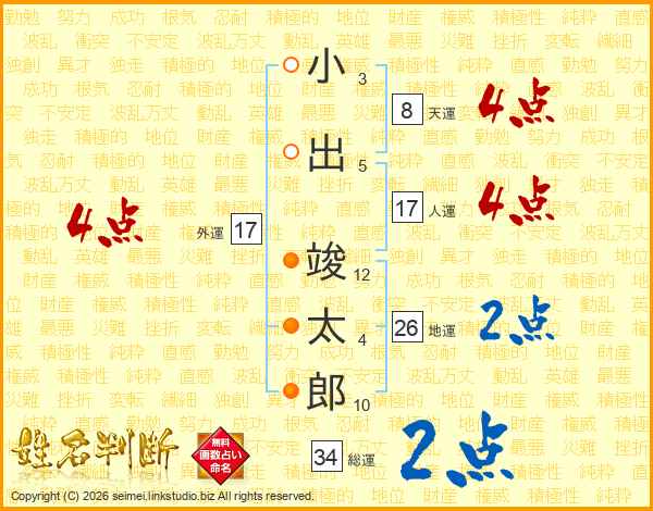 小(3画)出(5画) 竣(12画)太(4画)郎(10画)