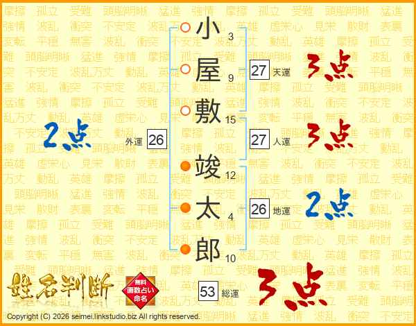 小屋敷竣太郎さんの総運は53画の3点!