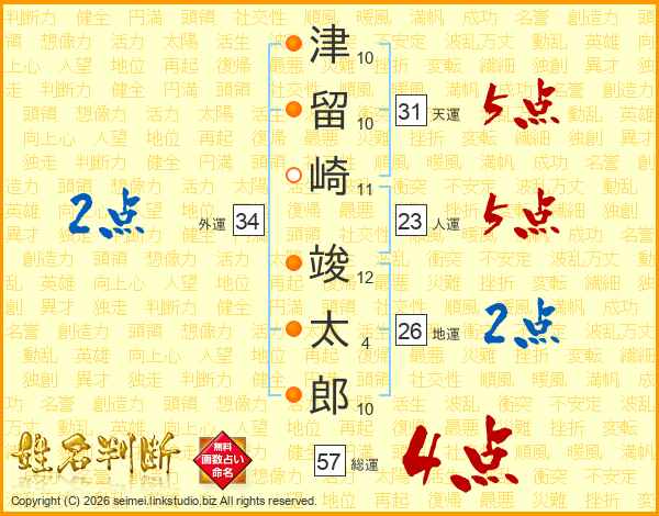津(10画)留(10画)崎(11画) 竣(12画)太(4画)郎(10画)