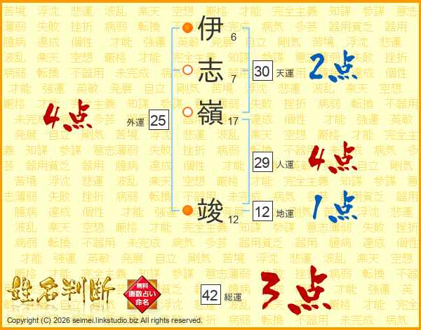 伊(6画)志(7画)嶺(17画) 竣(12画)