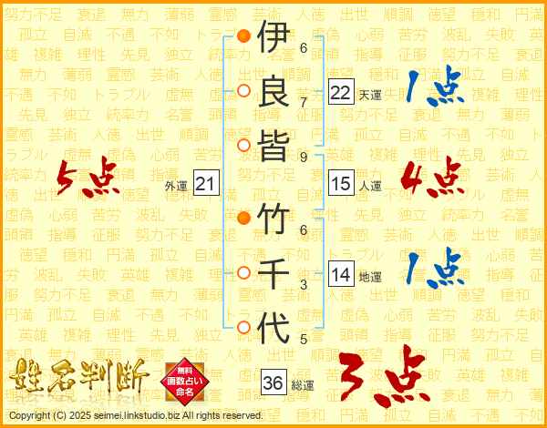 伊(6画)良(7画)皆(9画) 竹(6画)千(3画)代(5画)