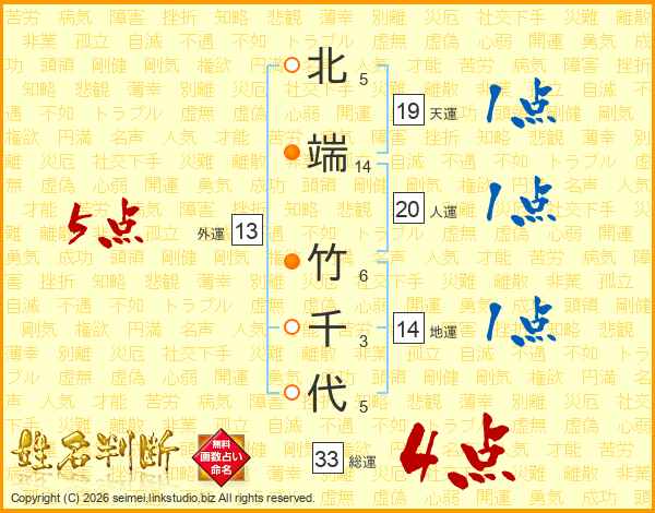 生活面を象徴する運勢です。外部から受ける影響力を表し、結婚運、家庭運や職場、環境への順応性を表します。総運から人運を引いた画数。姓や名が1文字の場合を除く。